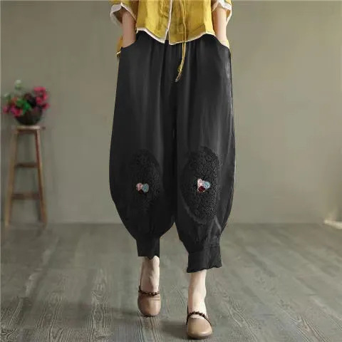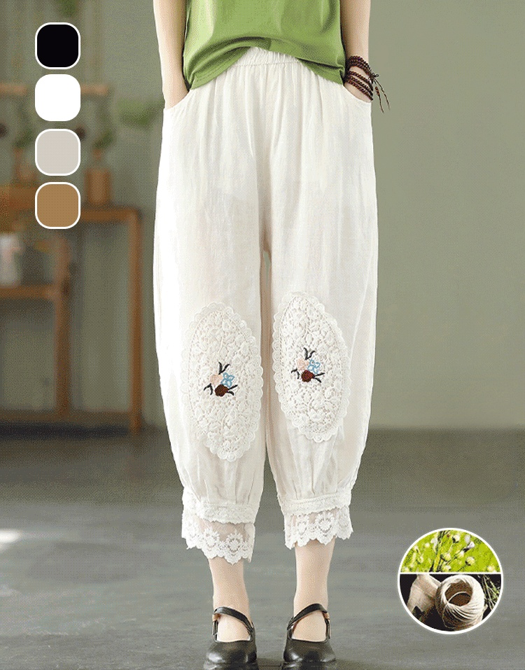 กางเกงผ้าคอตตอนลินินผู้หญิง ทรงบลูมเมอร์ ปักลาย แต่งลูกไม้